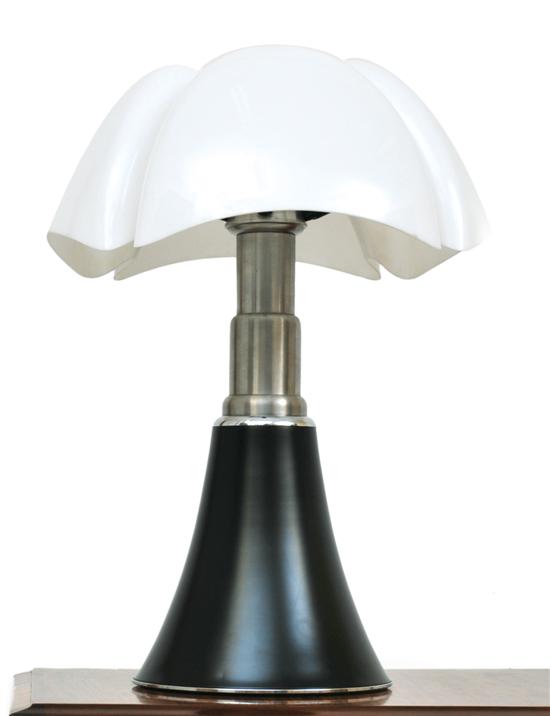 The lamp of a tapering conical base rising to a telescopic brushed steel stem, beneath an opaque white acrylic lobed shade, rubber plaque to base Pipistrello, Martinelli Luce, Design Gae Aulenti, Made in Italy, 73cm high.