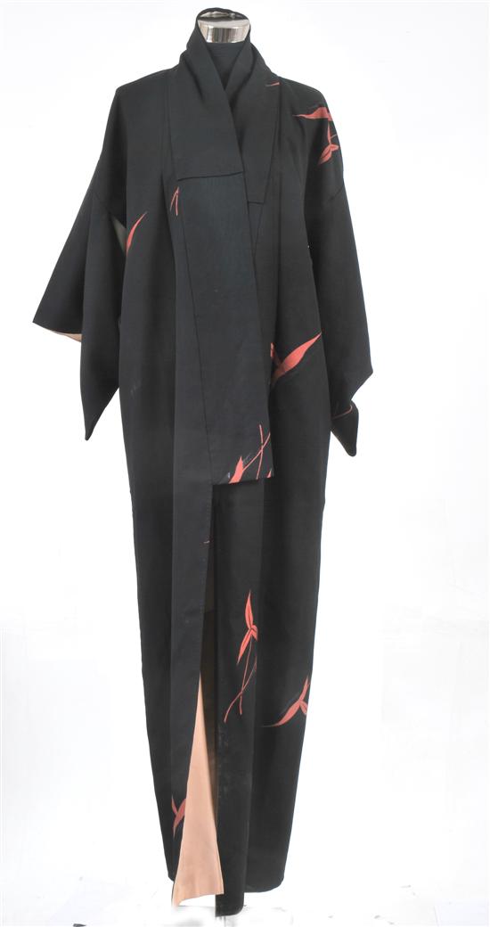 The kimono of black waffle weave silk with a woven bamboo pattern in cinnamon, back length 152cm.
