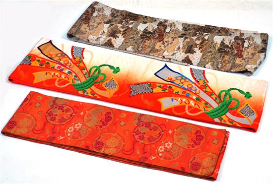 Including a Nagoya obi of brocade design in autumn tones, a Fukuro obi embroidered on an ombre orange ground and a narrow Maru obi in orange brocade, the longest 420cm.