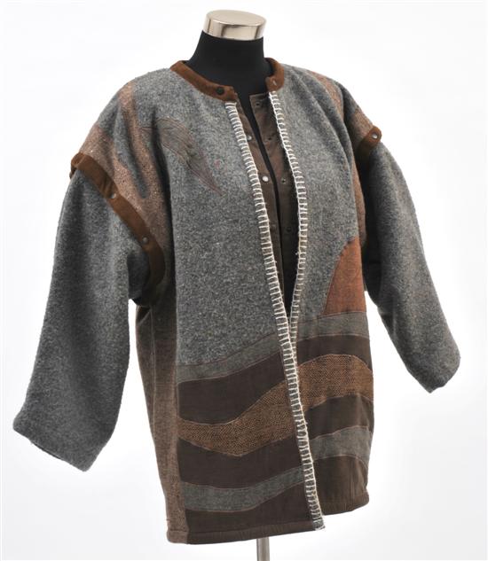 Labelled 'Prue Acton', the box cut jacket with detachable sleeves all trimmed in suede and featuring an appliquéd bush scene of kangaroos, labelled size 10.