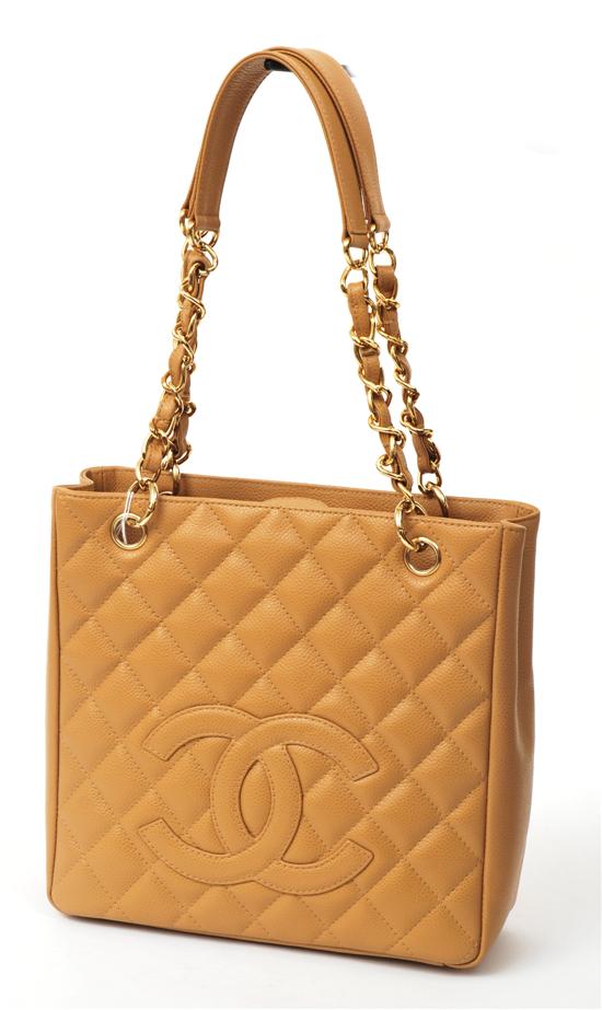Styled in quilted beige caviar leather the gussetted tote with monogram front and short leather and gilt metal chain straps , 25 x 24cm, boxed.