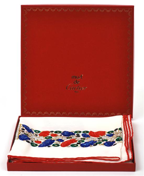 The scarf printed with a classic bejewelled belt as border on a white jacquard ground, 88cm square, boxed.