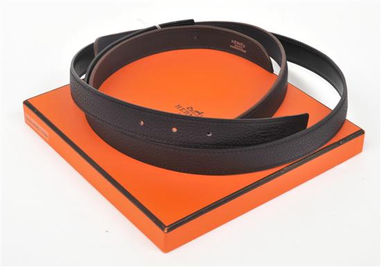 Styled in purple leather suitable for use with detachable buckles, one 76cm, the other 109cm, with original box.