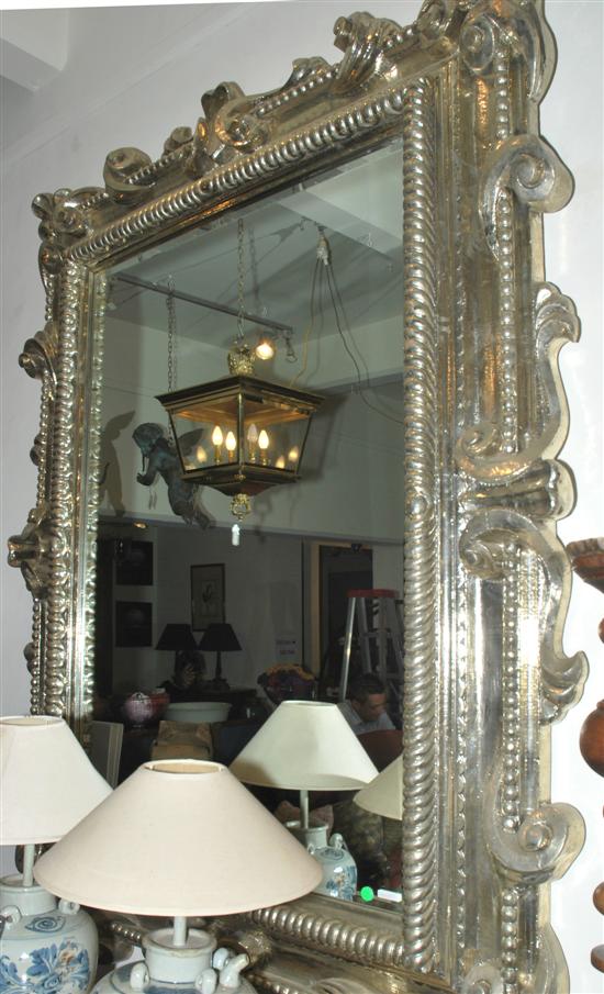 A SUBSTANTIAL SILVER FOIL OVERLAID WALL MIRROR The bevelled rectangular plate within a boldly carved surround applied with silver foil, 205 x 165cm.