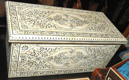 AN INDIAN BONE VENEERED CAMPHOR WOOD STORAGE CHEST*Rectangular, with a hinged lid, the whole with painted floriate decoration and borders, 82.5 x 37.5 x 38cm.Note: for buyers intending to export this lot outside of Australia, CITES regulations apply. Contact department for details.