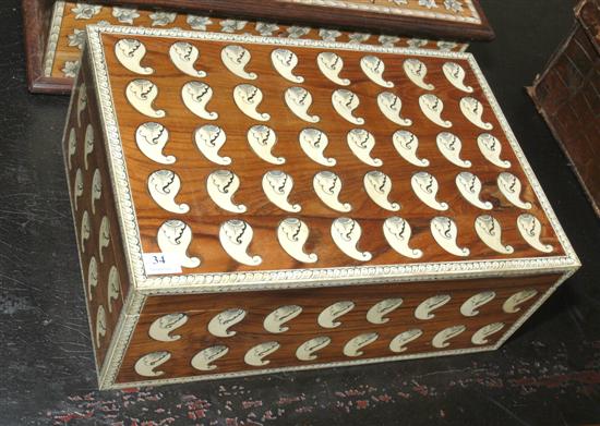 Rectangular, with a hinged lid, the whole with repeating botteh motifs, 38 x 15 x 25.5cm.Note: for buyers intending to export this lot outside of Australia, CITES regulations apply. Contact department for details.