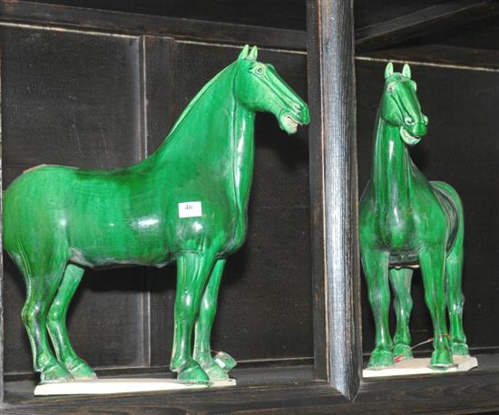 A PAIR OF TANG STYLE GREEN GLAZED EARTHENWARE HORSES