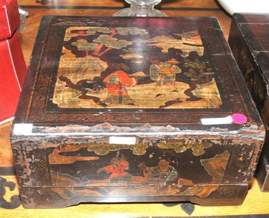 A CHINESE BLACK LACQUERED STORAGE CONTAINER The square cover painted with a scene depicting figures in a garden, 38 x 18 x 38cm