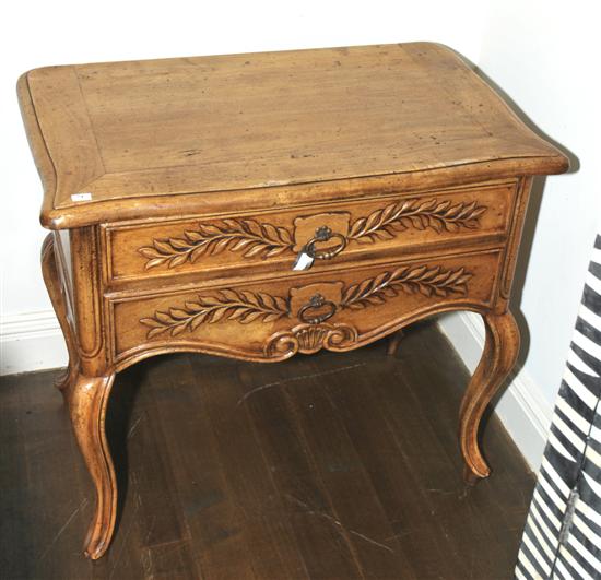 A FRENCH PROVINCIAL STYLE FRUITWOOD SIDE TABLE Rectangular with two lower carved frieze drawers, raised on slender cabriole legs, 80 x 49 x 72cm.