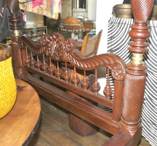 A REGENCY STYLE TEAK FOUR POSTER BED The feather and shell carved bedhead beneath a canopy supported by wrythen posts with brass collars, the reeded foot with a row of turned bobbins, raised on baluster supports, 240 x 218 x 195cm.