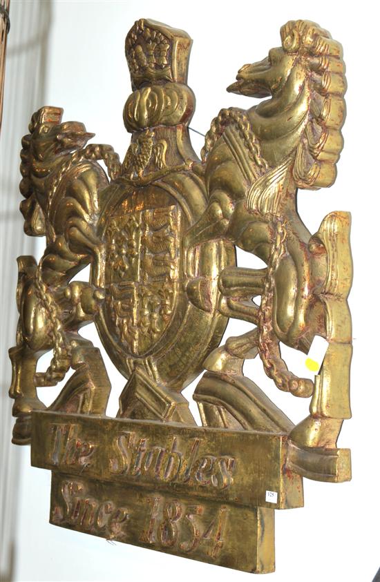 A GILT FOIL OVERLAID HERALDIC CREST Entitled 'The Stables, Since 1854,' 102 x 96cm.