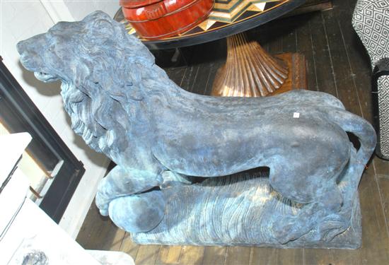 A PAIR OF COMPOSITE LION FIGURES Each standing animal modelled with one paw raised on a sphere, 107cm high.