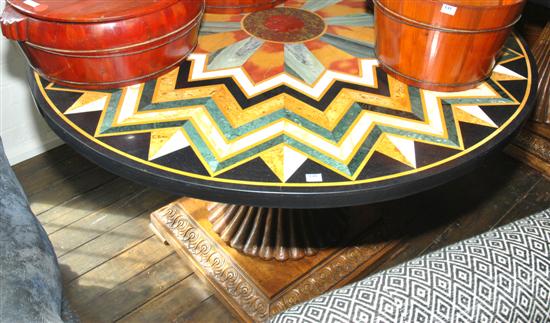A CIRCULAR OAK AND MARBLE SPECIMEN SIDE TABLE The circular top with a radiating pattern of multi coloured marble segments, above a tapering fluted stem raised on a square foot, 122cm diameter x 80cm high.