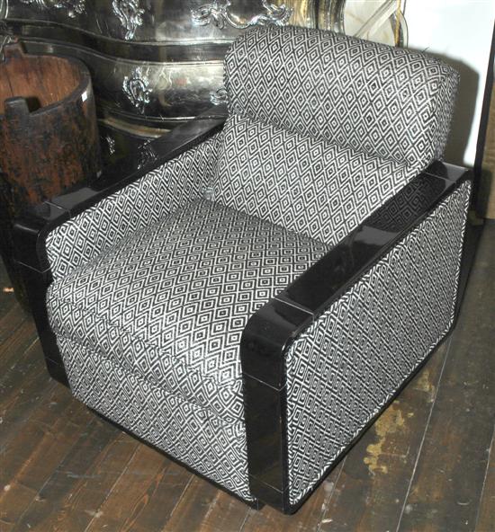 A THREE PIECE ART DECO STYLE EBONISED AND UPHOLSTERED LOUNGE SUITE
