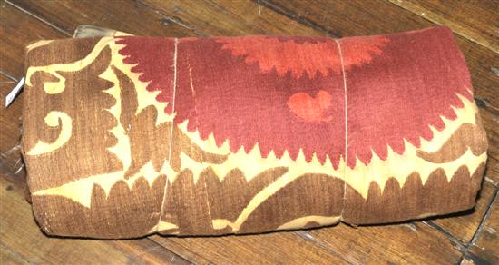 Embroidered in red and brown tones on a saffron ground, 360 x 230cm.