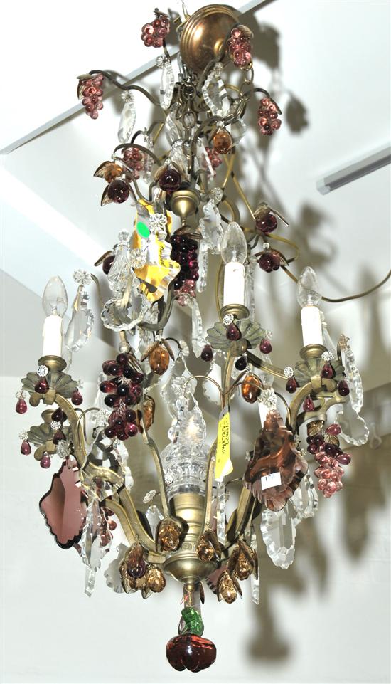 The open work brass body with six lights hung with coloured and clear glass prism lustres and fruit, 110cm high.