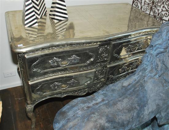 A LOUIS XV STYLE SILVER FOIL OVERLAID COMMODE The shaped rectangular top above four short drawers with foliate cast handles, raised on cabriole legs, 120 x 84 x 58.5cm