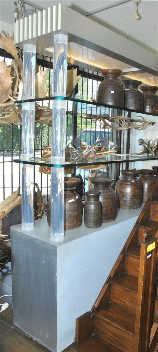 A BRUSHED ALUMINIUM DISPLAY CABINET BY PIERRE CARDIN CIRCA 1970 The illuminated rectangular top above two glass shelves with perspex supports, the body with an arrangement of drawers and two central doors, 241 x 234 x 46cm. Provenance: purchased from the private collection Garvin Mekin, New York by Guinevere, 574-580 Kings Road, London November 2006 - purchased from Guinevere by Graham Geddes Antiques Accompanied by a signed document verifying the above.