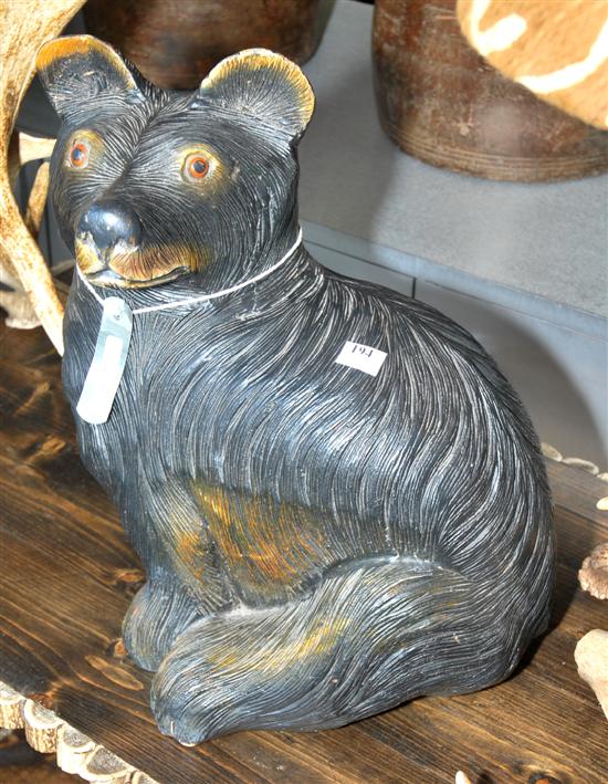 A CARVED WOODEN FIGURE OF A BROWN BEAR Naturalistically carved in a seated pose, 38cm high.