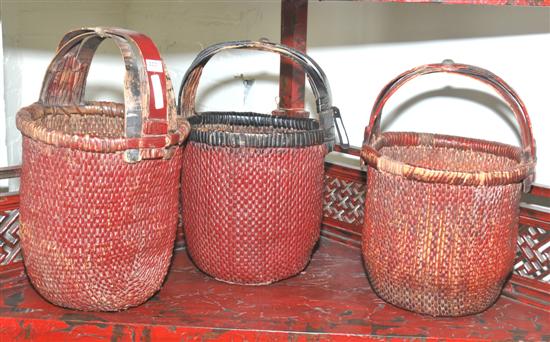 A GROUP OF THREE PAINTED WOVEN CANE BASKETS