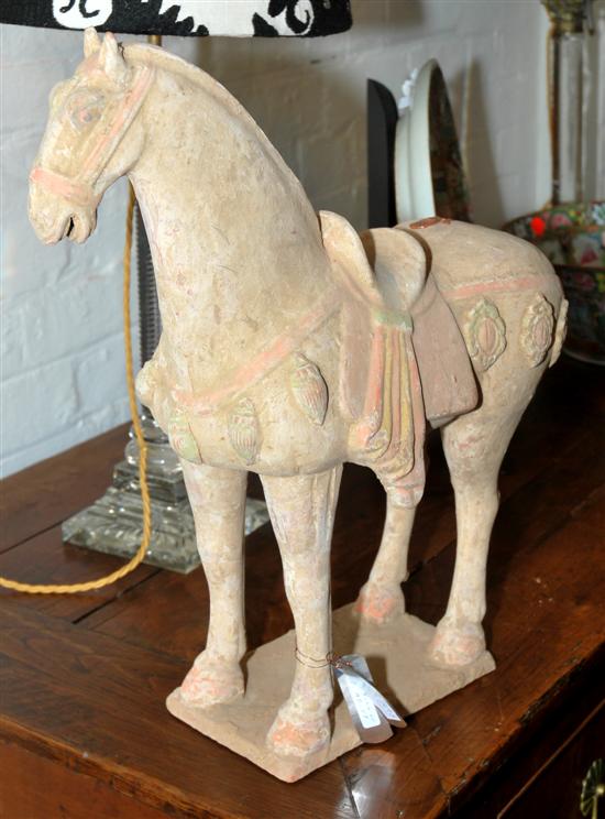 A PAIR OF TANG STYLE TERRACOTTA WAR HORSES Each mounted on a rectangular base, 54.5cm high.
