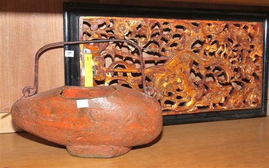 A PAINTED WOODEN CONTAINER AND A PIERCED GILTWOOD TEMPLE PANEL