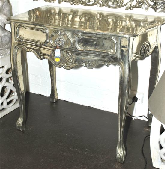 A LOUIS XV STYLE SILVER FOIL OVERLAID SIDE TABLE The shaped rectangular top above a frieze drawer and a shell carved apron, raised on cabriole legs, 93 x 79.5 x 57cm.