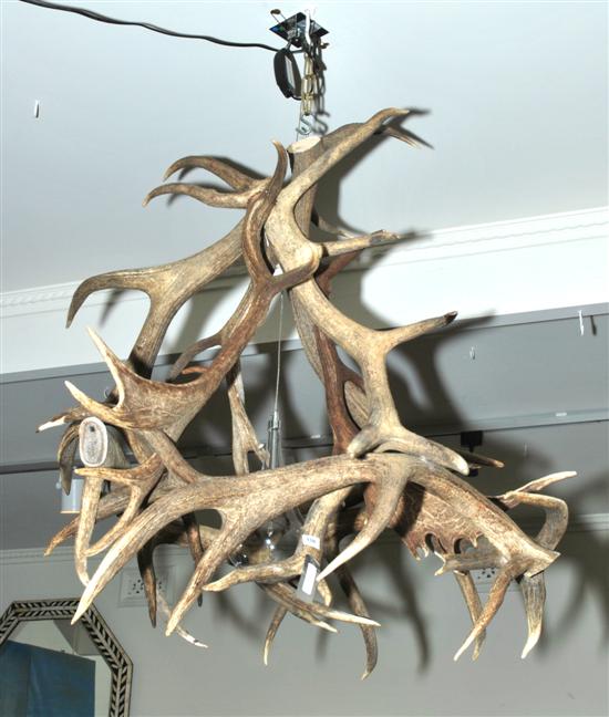 Open work body composed of interwoven antlers with a single light 90cm high.