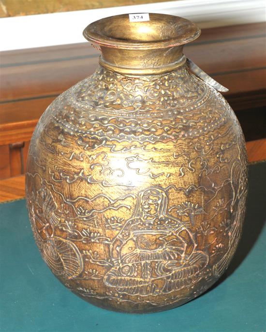 AN OVOID PAINTED WOODEN STORAGE JAR With raised decoration and gold patination, 36cm high