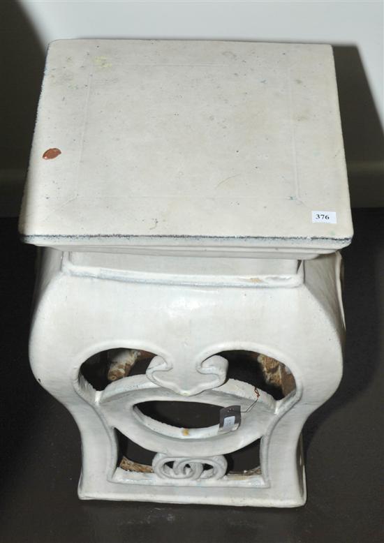 A CHINESE CREAM GLAZED EARTHENWARE BARREL STOOL The square top above pierced waisted sides, 34.5 x 52.5 x 34.5cm