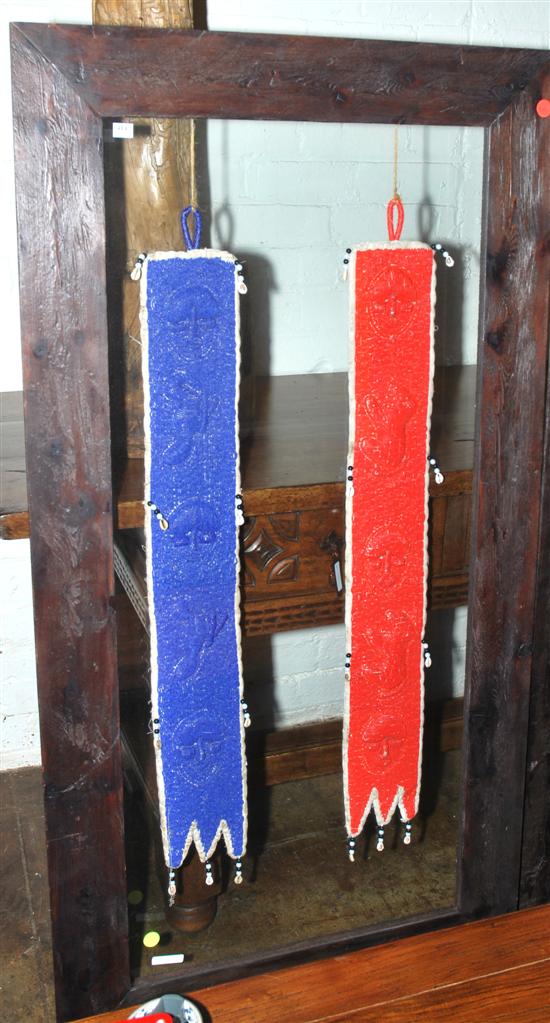 TWO BEADED AFRICAN WALL HANGINGS WITHIN A BOX FRAME In colours of red, white and blue, the frame 147.5 x 77cm.
