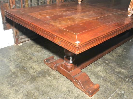 The rectangular top with parquetry panels, raised on turned supports and scroll feet united by a stretcher, 300 x 79 x 100cm.