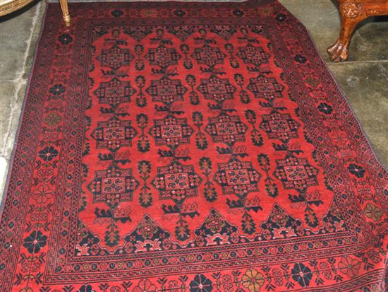 With a central repeating lozenge on a burgundy ground, 192 x 152cm.