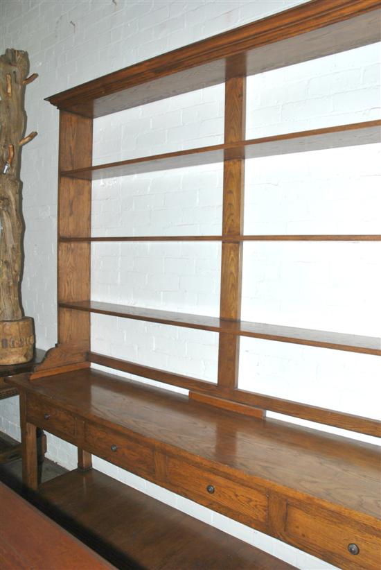 The open plate rack above a square top with four frieze drawers raised on square supports with a single shelf, 243.5 x 244 x 51cm.