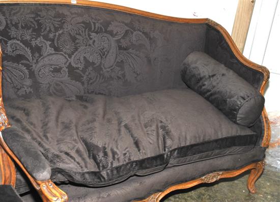 A FRENCH EMPIRE STYLE SETTEE The serpentine frame upholstered in chocolate brown velour, raised on cabriole legs, with matching bolsters, 208cm length of back.