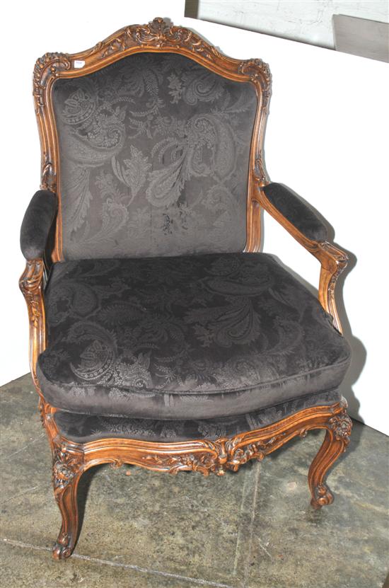 The open frames carved with foliate scrolls, upholstered in chocolate brown velour, raised on cabriole supports.