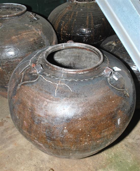 TWO SUBSTANTIAL GLAZED EARTHENWARE WATER JARS Each of baluster form, the largest 88cm high.