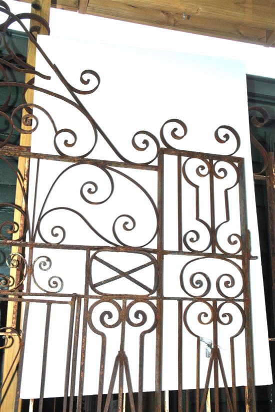 A PAIR OF WROUGHT IRON GATES Each with linear and scroll panels one panel inset with a smaller door, 301 x 152cm.