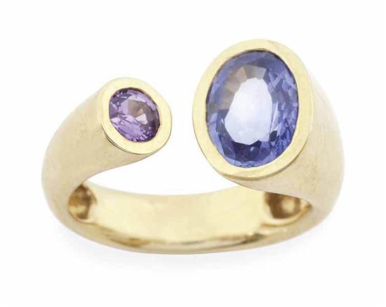 Of modern design, the tapering open shank set to its terminals with an oval blue sapphire and a round pink sapphire, in 18ct gold, independent valuation available, ring size L-M.