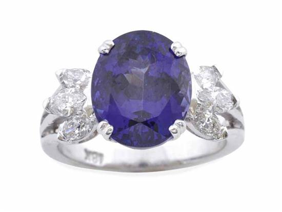 Centrally set with an oval tanzanite of 5.22cts with three marquise diamonds to either side, in 18ct white gold, independent valuation available, ring size K-L
