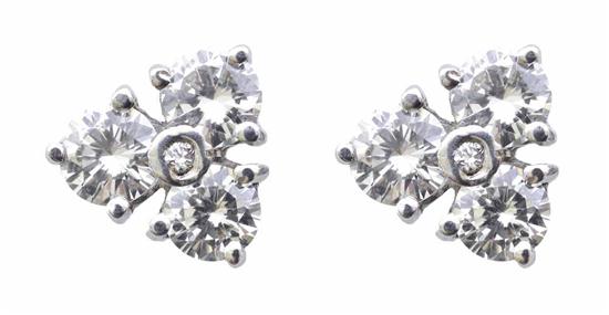 Each earring designed as a trefoil of diamonds totalling 0.77cts, to post and butterfly fittings, in 18ct white gold, independent valuation available.