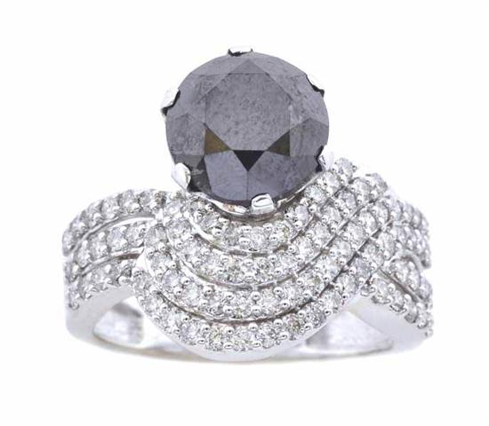 Featuring a round black diamond of 4.20cts within curved rows of round brilliant cut diamonds, in 18ct white gold, independent valuation available, ring size M-N.