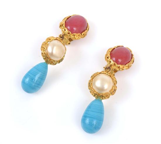 Styled in gilt metal, featuring pink and turquoise glass beads and faux pearls, to clip fittings, boxed.