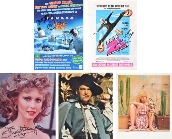 including seven 8 x 10 photographs signed by James Stewart, Micky Rooney, Douglas Fairbanks Jr., Oliver Stone, Debbie Reynolds, Brooke Shields and Olivia Newton John; a concert programme signed by Shirley MacLaine; and other subjects including Leslie Nielsen, Priscilla Presley and Drew Barrymore (a lot)