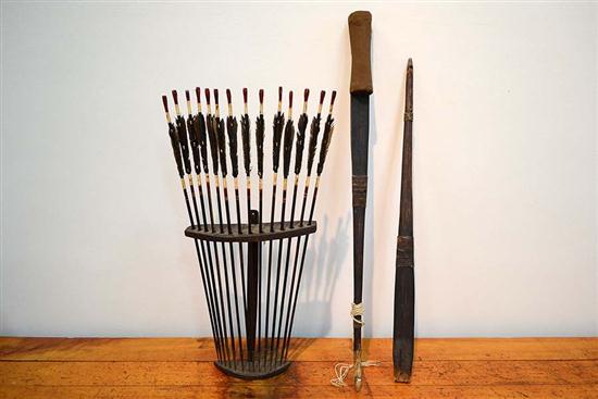 A PERIOD WOODEN TRAM ROUTE NUMBER SIGN WITH BRACKET