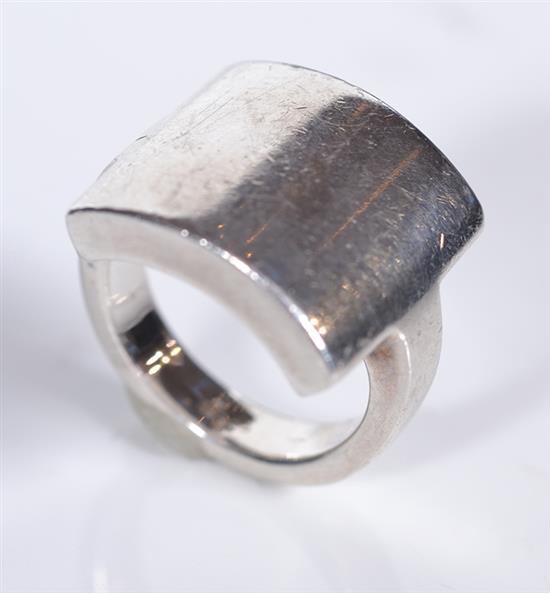 The plaque style ring styled in sterling silver, ring size I-J, boxed.