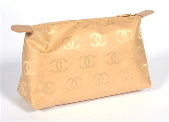 Styled in monogram champagne canvas with beige leather trim and gold metal hardware, 27 x 17 x 10cm.