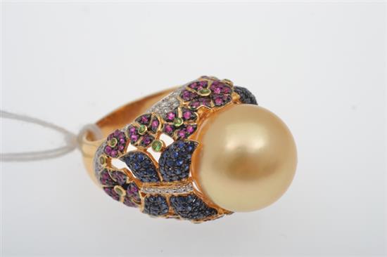 The round pearl of golden hue measuring 16.00mm, set in an elaborate pierced frame of flowers and butterflies pave set with diamonds, blue and pink sapphires and tsavorite garnets, mounted in 18ct gold, ring size M.