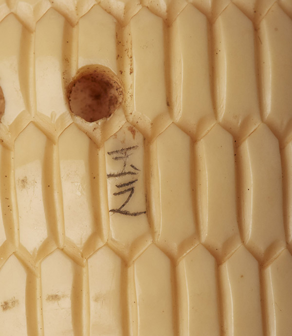 Modelled as a partly clothed couple in erotic embrace on a woven basket, signed, 5cm long.