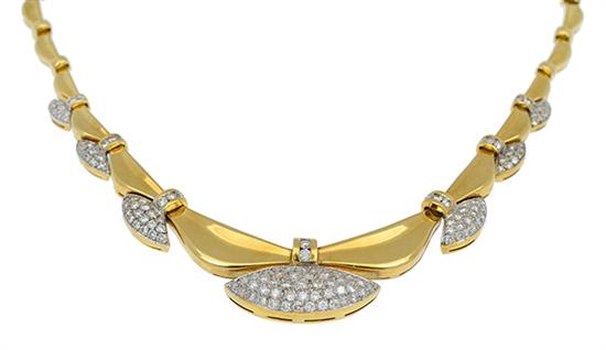The graduated demi lune polished links centrally set with seven pave set diamond panels, mounted in 18ct gold, total length 400mm.